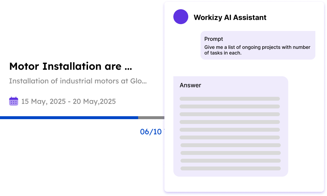 Let Workizy AI handle the repetitive thinking — generating task lists, organizing projects, and pulling team updates instantly. Just ask, and get the answers you need without digging, searching, or waiting.